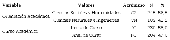 1. Variable Orientación Académica. Agrupa los casos que declararon estar cursando las titulaciones de Pedagogía, Historia, Ciencias Sociales y Ciencias Económicas, creando una variable denominada Orientación Académica en Ciencias Sociales (CS en adelante): NCS = 245, (56,5%); y las titulaciones de Ingeniería Ambiental, Ciencias Biológicas, Agronomía y Química, que se codificaron como una variable denominada Orientación Académica en Ciencias Naturales (CN en adelante): NCN = 189 (43,5%).
