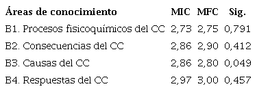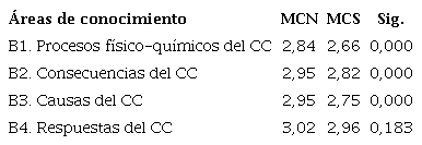 Los resultados del Cuadro 2 indican que los estudiantes que cursan titulaciones relacionadas con las Ciencias Naturales e Ingenierías obtuvieron mayores puntuaciones que los que cursan titulaciones relacionadas con las Ciencias Sociales y Humanidades. Los resultados reportan diferencias en todos los bloques de conocimiento a excepción del bloque 4 sobre soluciones. Sin embargo, los resultados de la variable Curso Académico (Cuadro 3) no permiten relacionar un mayor conocimiento sobre el CC al avanzar en el transcurso universitario.