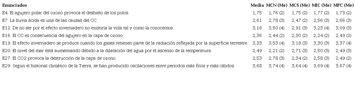 Con relación al conocimiento sobre algunos de los procesos fisicoquímicos que intervienen en el sistema climático y en el cambio climático actual, los resultados de lo Cuadro 4 muestran que el estudiantado universitario de la UFPR posee representaciones, de determinados procesos, coherentes con el conocimiento científico. Así, más del 70% de los estudiantes reconocen que el efecto invernadero es un fenómeno que permitió y permite la vida en la Tierra (E12), confirmando casi el 90% el proceso por el que se produce (E19). Además, más del 90% confirman la existencia de una variabilidad climática natural (E29). Sin embargo, en torno a un 50% no comprenden la relación entre el proceso de dilatación del agua y el consecuente aumento de nivel del mar (E20). Por otro lado, existe un conjunto de enunciados que ilustran la persistencia de representaciones alternativas como es la que vincula la degradación de la capa de ozono con consecuencias reconocidas del CC como el deshielo de los polos (E4) o como causa del propio CC (E16). Un 50% cree que el CO2 es un factor de degradación de la capa de ozono (E27) y un porcentaje similar consideran que la lluvia ácida es una de las causas del CC (E7).