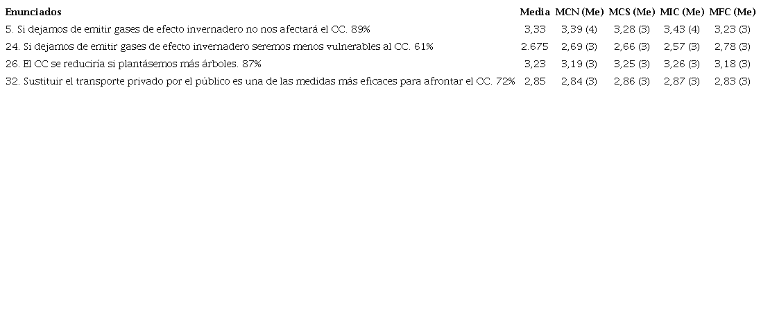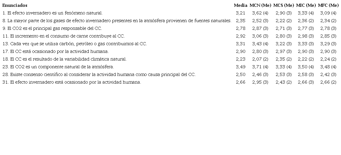 La primera sección relativa a conocimientos sobre CC (32 ítems) obtuvo un índice del alfa de Crombach de α = 0,675. Aunque el límite para un nivel aceptable es de 0,7, siguiendo a Hair et al. (2010) consideramos este valor aceptable para estudios exploratorios.