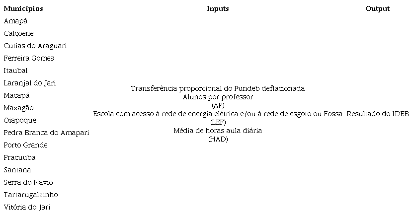 Considerando-se essa motivação, o estudo foi realizado abarcando todos os 16 municípios do estado do Amapá, embasado nos dados municipais relativos ao 5º ano do ensino fundamental, referentes às escolas da rede/dependência administrativa municipal. Serão utilizados dados em painel referentes ao intervalo de tempo de 2010 a 2019, sendo, portanto, 16 municípios estudados ao longo de 10 anos, analisados ano a ano, em um total de 160 municípios/ano, que correspondem às Unidades Tomadoras de Decisão (DMUs).