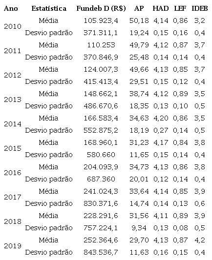 Para esse tipo de pesquisa, é desejável o uso de insumos defasados, pois inputs aplicados em períodos anteriores viabilizam parte do desempenho escolar apresentado pelos alunos na posteridade. Não foi possível o uso de recursos defasados no presente estudo; contudo, considerando que o IDEB é realizado bienalmente, em anos ímpares, os dados do IDEB disponíveis para os anos pares na base são repetições da nota anterior, de forma que os resultados apresentados em um ano são fruto de insumos do mesmo ano e do ano antecedente.