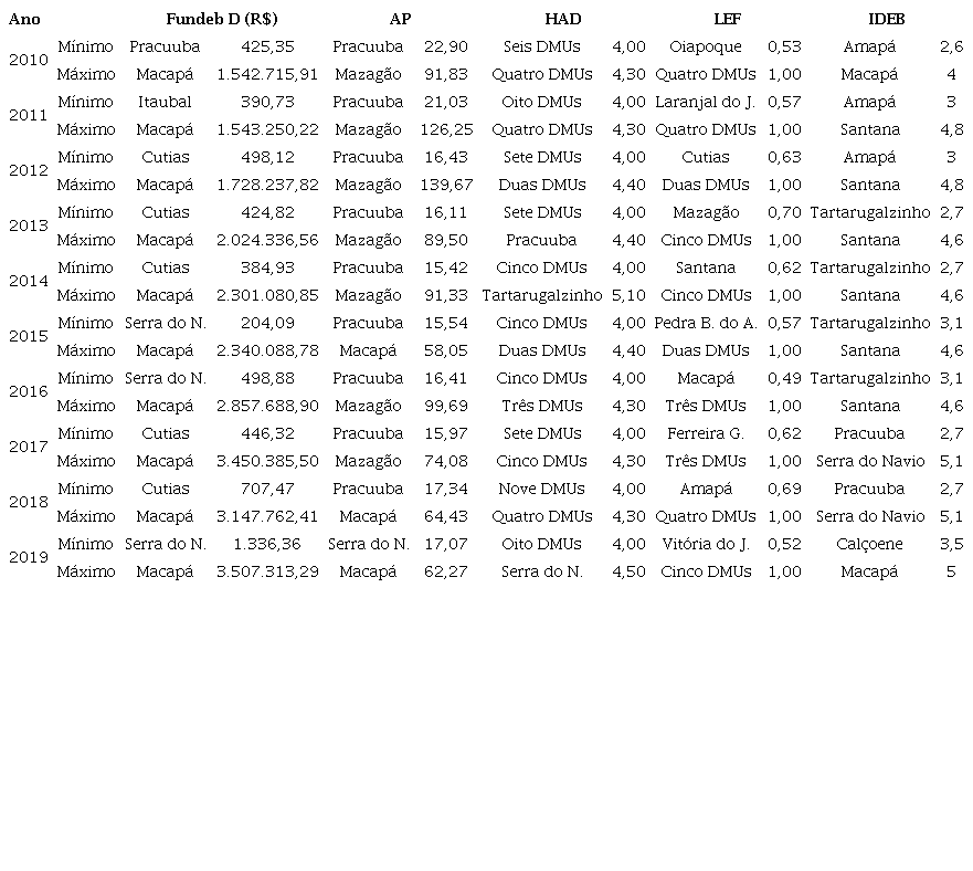 Quanto ao número de alunos por professor, o ano com a maior média foi 2010, com 50,18, e o de menor média foi 2019, com 29,70. De 2010 a 2019, o número de alunos por professor reduziu 40,82%. Não obstante, observa-se bastante desigualdade, pois algumas DMUs apresentaram valores mínimos baixos, como Pracuuba, em 2014, com apenas 15,42 alunos por professor, enquanto Mazagão chegou a ter 139,67 alunos por professor em 2012. Não deve ser descartada a possibilidade de equívoco nas declarações realizadas pelos gestores que alimentam as bases de dados do INEP. Sem embargo, considerando o largo espaço de tempo analisado e o reiterado número exorbitante de alunos referente aos mesmos municípios, é necessária a reflexão acerca dos motivos para a superlotação de salas de aula apontada na análise descritiva do número de alunos por professor.