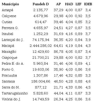 Todos os municípios tiveram aumento nas notas do IDEB de 2010 a 2019, exceto Pracuuba. O município com menor média das notas de IDEB ao longo do tempo foi Cutias, com 3,2, e o de maior média foi Santana, com 4,6. Quanto à proporção dos recursos do Fundeb, o que mais recebeu foi Macapá, enquanto Cutias foi o que recebeu menos. Quanto ao número de alunos por professor, Mazagão é o município que apresenta maior média, de 86,78 alunos por professor e Serra do Navio, com a menor média, de 21,71. A média de horas-aula de todo o estado do Amapá manteve-se entre 4 e 4,32 horas. O município com maior acesso à energia elétrica e/ou esgoto ou fossa foi Calçoene, com 92%, enquanto o de pior infraestrutura foi Oiapoque, com média de 82%.