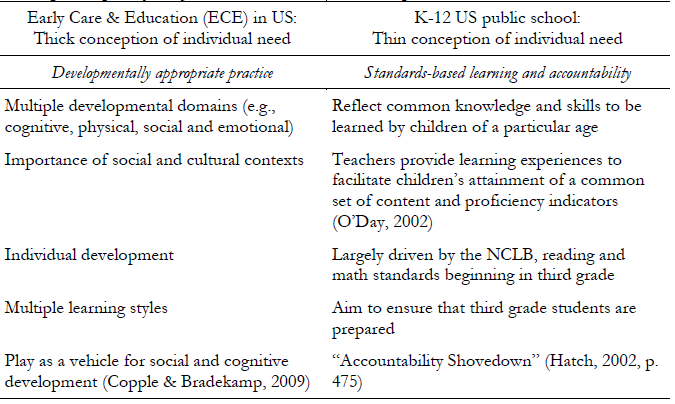 Inequalities. The past decade in the US has witnessed an explosion of attention to the leveraging of enhanced early educational experiences for students who may otherwise arrive in school less prepared with early literacy, numeracy, and socioemotional skills. While the language of politicians and educators is about broad early childhood experiences, this policy lever has aimed at the enhancement of learning opportunities and socialization of 4 year olds in a program referred to as Pre- Kindergarten (Obama, 2014). The recent push by professional organizations, states, and national governments has been on making PreK universal (e.g., UPK) promoting access to PreK for all 4 year olds (Rose, 2010). It has achieved national prominence in the US, and the motivation behind the movement to increase access to PreK programs can be found in the literature on the successes of early care programs (e.g., Deming, 2009) in what is termed Early Care and Education (ECE) and the expanded reach of the K-12 educational system to include PreK programs for 4 year olds. McCabe & Sipple (2011) have examined these “colliding worlds”, including their political, professional, and curricular differences. In short, the ECE world is built upon a set of assumptions and interventions that privilege a thick conception of need, while the K-12 version of PreK is typically designed and implemented using the thin conception of individual need. In addition, the ECE world represents the semi-formal sector described in a previous section reviewing the social services literature, while the K-12 system can be characterized as the formal sector. Table 1 summarizes key differences in the teaching philosophies of the ECE and K-12 worlds. We use these differences to illustrate the thick version of individual need (ECE) and the thin version (K-12). The ECE principles include multiple developmental domains and highlight the development of a child in both a social and cognitive manner. Conversely, the professionalized model of education in schools (K-12) targets almost exclusively the cognitive domains of learning in learning specific content driven by state-established standards.