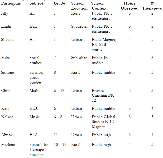 Ultimately, 10 teachers participated in the study, a number arrived at when we reached representation from elementary, middle, and high school teachers and the subject areas of English, math, social studies, science, language, and the arts. This allowed us to search for signature pedagogies that were present across grade levels and content areas. The selected participants represented a cross-section of elementary school teachers (Ally, Linda and Shauna), middle school teachers (Mike, Simon, Chris, Kate, and Nelson), and high school teachers (Alyssa and Marlene). Two of the elementary school teachers taught all subject areas, and one taught ESL students in all subject areas. Middle school and high school teachers were also selected to represent a variety of content areas, including math (Chris), science (Simone), English language arts (Kate and Alyssa), and music (Nelson) in addition to the more commonly examined areas within global education literature of social studies (Mike and Simone) and world languages (Marlene). The school context of the 10 teachers varied as well. Shauna, Mike, and Nelson taught in global-themed public magnet schools. Linda and Mike taught in suburban contexts. Shauna, Nelson, and Alyssa taught in urban schools. Ally, Simone, and Marlene taught in rural schools. Chris taught in a private Christian school.