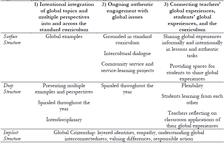 Overall, we found that each teacher demonstrated the same core signature pedagogies throughout his or her regular instruction, embodying Shulman’s (2005) supposition that signature pedagogies are “pervasive” and “routine.” The three signature pedagogies evident across content areas were: 1) intentional integration of global topics and multiple perspectives into and across the standard curriculum; 2) ongoing authentic engagement with global issues; and 3) connecting teachers’ global experiences, students’ global experiences, and the curriculum. In this section, we describe overall trends and specific examples of signature pedagogies across the 10 participants, illuminating for each signature pedagogy the surface, deep, and implicit structures (Shulman, 2005) that K-12 educators evoked in preparing students to be citizens of the world (illustrated in Table 2).