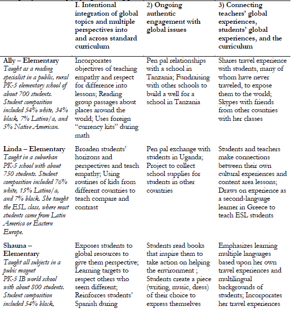 First, all 10 teachers used global examples—that is, examples that introduced students to diverse countries and cultures or to conditions and challenges common across the human experience (Ukpokodu, 1999)—and presented students with multiple perspectives to teach their content area standard course of study. In doing so, they infused global citizenship goals such as empathy, tolerance, and valuing multiple perspectives alongside conventional curriculum standard objectives.