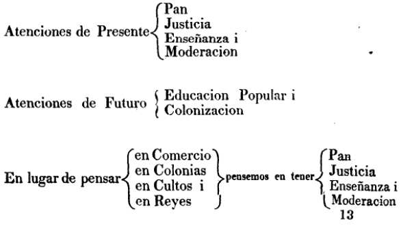 La farsa de los 3 poderes, es tán sosa, tán sin gracia, que ni la burla merece: es una parodia de la constitución inglesa, i un mal remedo de la modificación que han hecho los Estados Unidos. Al rei no volvemos, ni a la república llegamos… ¿qué haremos?... pensar, en lugar de imitar. ¡Así tuviera yo con qué pagar la impresión de mis sentimientos!6.