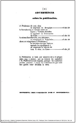 La introduccion á una obra intitulada “Sociedades Americanas en 1828… &” se publicó en Arequipa, á principios de aquel año, ofreciendo hacer la exhibicion por cuadernos—no se pudo cumplir la oferta entónces.