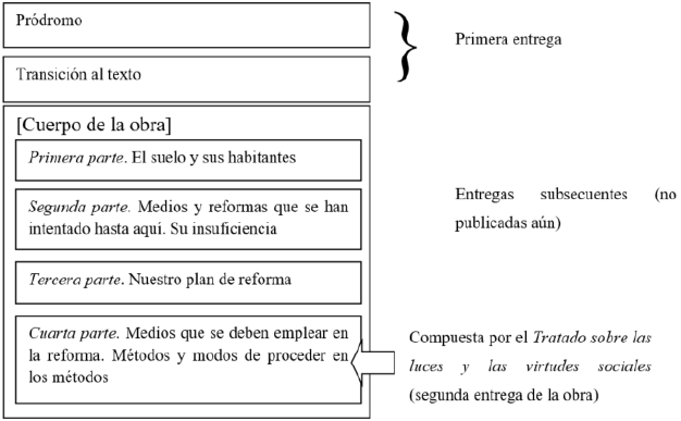 El texto que estamos leyendo, discurso preliminar a Sociedades americanas en 1828, se presenta, por tanto, como la primera entrega de un tratado filosófico amplio y ambicioso que debería publicarse poco a poco, a la manera de las novelas por entregas de esa época. Pronto, los interesados recibiríamos la segunda entrega, que tendría el primer capítulo de la obra acompañado por las cartas de los lectores que responden al discurso preliminar, cartas que se integrarían con ese primer capítulo de una forma que no se nos ha explicado detalladamente… Para hacer más clara esta propuesta, la resumiremos en un esquema que integra los datos que, hasta ahora, hemos logrado reconstruir con ayuda de la edición de Arequipa: