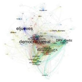 La forma de difusión de mensajes en las redes sociales puso al desnudo las características complejas de la estructuración del 15M, pues si bien involucraba a cualquier participante, estaba condicionada por la conectividad de los usuarios (de redes sociales) involucrados.