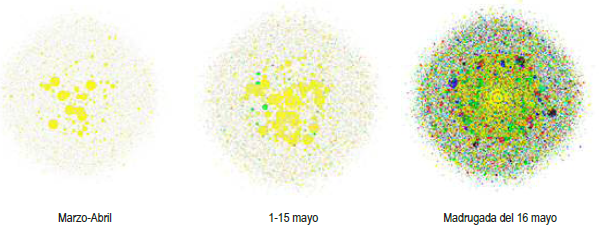 Los gráficos de la evolución del movimiento medido en término de su incidencia en las redes sociales han sido publicados, y muestran como de manera explosiva emerge el 15M a partir de la noche del 16 de mayo.