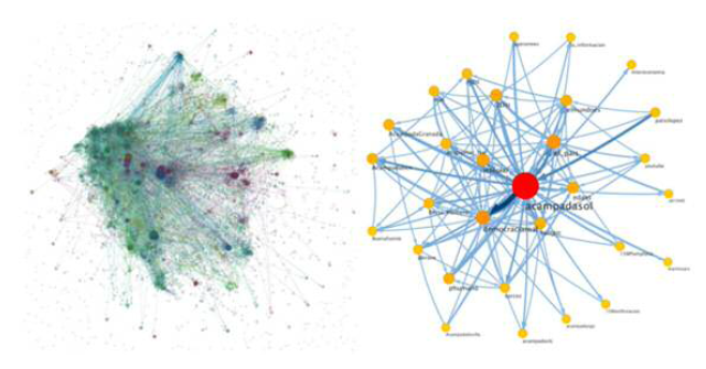 En la estructura final fruto de las interraciones acumuladas por los usuarios de la red social emergen grupos distinguibles, separables en comunidades. A la izquierda puede apreciarse cómo los nodos de la red han sido clasificados en distintas comunidades tal y como las ha detectado un algoritmo de clusterización. A la derecha, para facilitar una visión más intuitiva, se presentan sólo las 30 comunidades más relevantes del movimiento. Cada nodo representa una comunidad “compactada”, y la etiqueta que acompaña cada nodo corresponde al hashtag dinámicamente más relevante de esa comunidad (en otras palabras, el “aglutinador” de la misma)25.