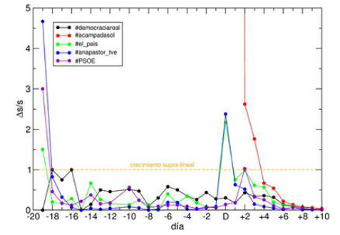 El proceso de maduración de la protesta no es lento, lineal, suavemente progresivo; al contrario: es abrupto. En los días anteriores al surgimiento del movimiento el sistema está adormecido, es muy pequeño; y en menos de 6 días es capaz de aglutinar a todo el colectivo. Esta efervescencia es un dato que apoya también la hipótesis de “espontaneidad” o emergencia, alejando los rumores de que el movimiento estaba de algún modo manipulado para incidir en el resultado electoral del 22M. El patrón de crecimiento del movimiento recuerda otros ejemplos bien conocidos en el ámbito de la criticalidad auto- organizada (fenómenos críticos en física, economía, avalanchas, terremotos...)23.