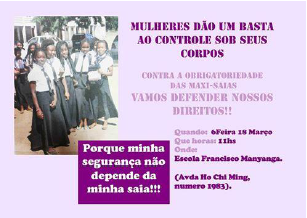 In this context, I choose to bring to the discussion a critical moment that occurred between March and April 2016, where this abyssal line became vividly apparent: the rally that took place in Maputo (18/03/16), the capital of Mozambique, organized to protest against the governmental suggestion to oblige all girls in elementary and secondary school to wear maxi-skirts. Two main arguments were used to legitimize such a measure. The first was about the power of maxi-skirts to control and avoid male15 harassment and early pregnancies. The second concerned the idea that mini-skirts do not conform to African traditions, so girls must learn how to behave as authentic African women. Rapidly, coercive laws popped up in almost every public school obliging all girls to wear maxi-skirts to attend classes. Women and girls were not listened to and were even advised to humbly accept the procedures for their own sake. During the rally, several women and girls were arrested and one foreign activist was expelled from the country after a controversial criminal process.
