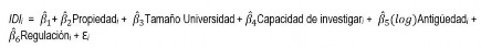 Para determinar el impacto de la regulación, se propone un modelo (expresión 2) que se estima por medio del método de mínimos cuadrados ordinarios. Se puede observar que el modelo muestra que el índice de divulgación de información – IDI está en función de las características de las universidades y, la regulación; esta última se explica más adelante en esta misma sección. Las variables relacionadas con las características de las universidades se obtuvieron desde bases de datos públicas de cada uno de los cincos países establecidos en la muestra. Abello (2018) y Abello et al. (2018) muestran en sus trabajos que existe una alta correlación entre las características de las universidades y el nivel de divulgación de información; esto conlleva a que las variables puedan ser consideradas como variables explicativas en el modelo que se propone en esta investigación.