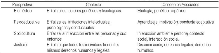 En esta línea, la discapacidad intelectual ha sido abordada desde una perspectiva biomédica,psicoeducativa, sociocultural y de justicia (Shyman: 2016; Shogren et al.: 2017). Todo esto significa una construcción social basada en la interacción de las personas y sus entornos, los derechos humanos y legales que operan en esos entornos y los roles que desempeñan las personas con discapacidad intelectual y sus familias dentro de la sociedad (Tabla 1).
