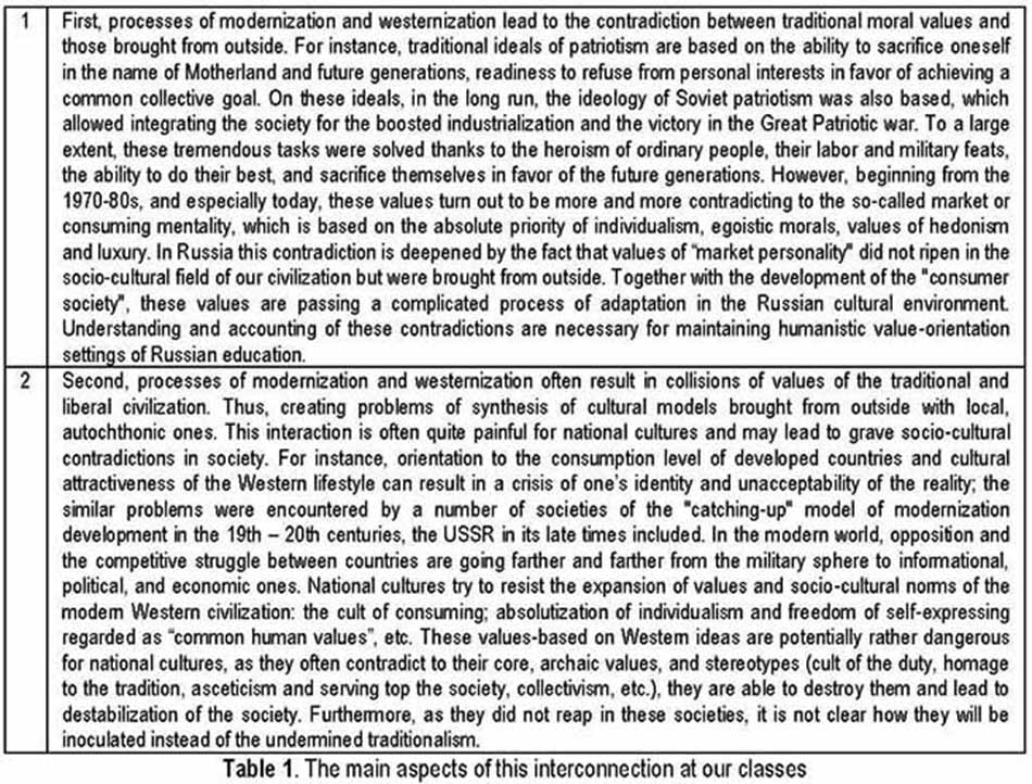 In the course of history, under conditions of restricted academic time for studying thereof, the major attention should be paid at key problem aspects (considered in chapters Discussion and Results), adequate understanding whereof is important for assimilating the course and improving general and professional competences of future graduates. Such topical issues of the course as peculiarities of the "catching-up" Russian modernization and related to that socio-cultural contradictions of Russian society are also of great importance. Their studying allows us to comprehensively ponder over today's trends of development of Russian society to find out the interconnection of the history and contemporary times in various spheres of vital activities for enhancing students' training quality.