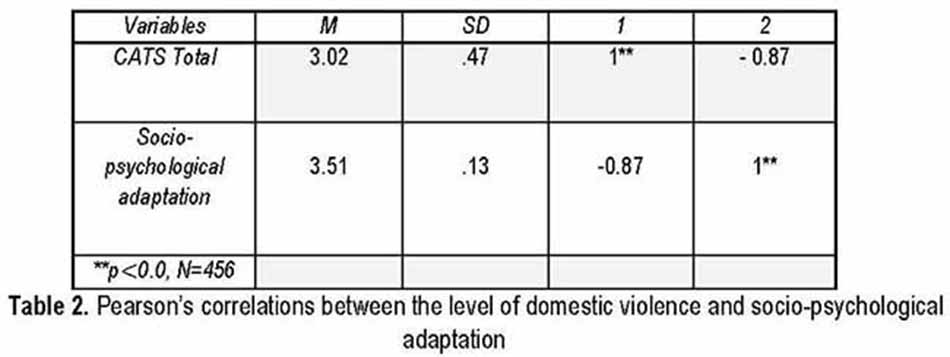 Pearson’s correlation analysis showed that there is a negative correlation between the level of domestic violence and socio-psychological adaptation since the Pearson correlation coefficient is 0.87. This suggests that domestic violence contributes to difficulties in adapting, accepting oneself, establishing relationships in society, causes conflict behavior, isolation in oneself.