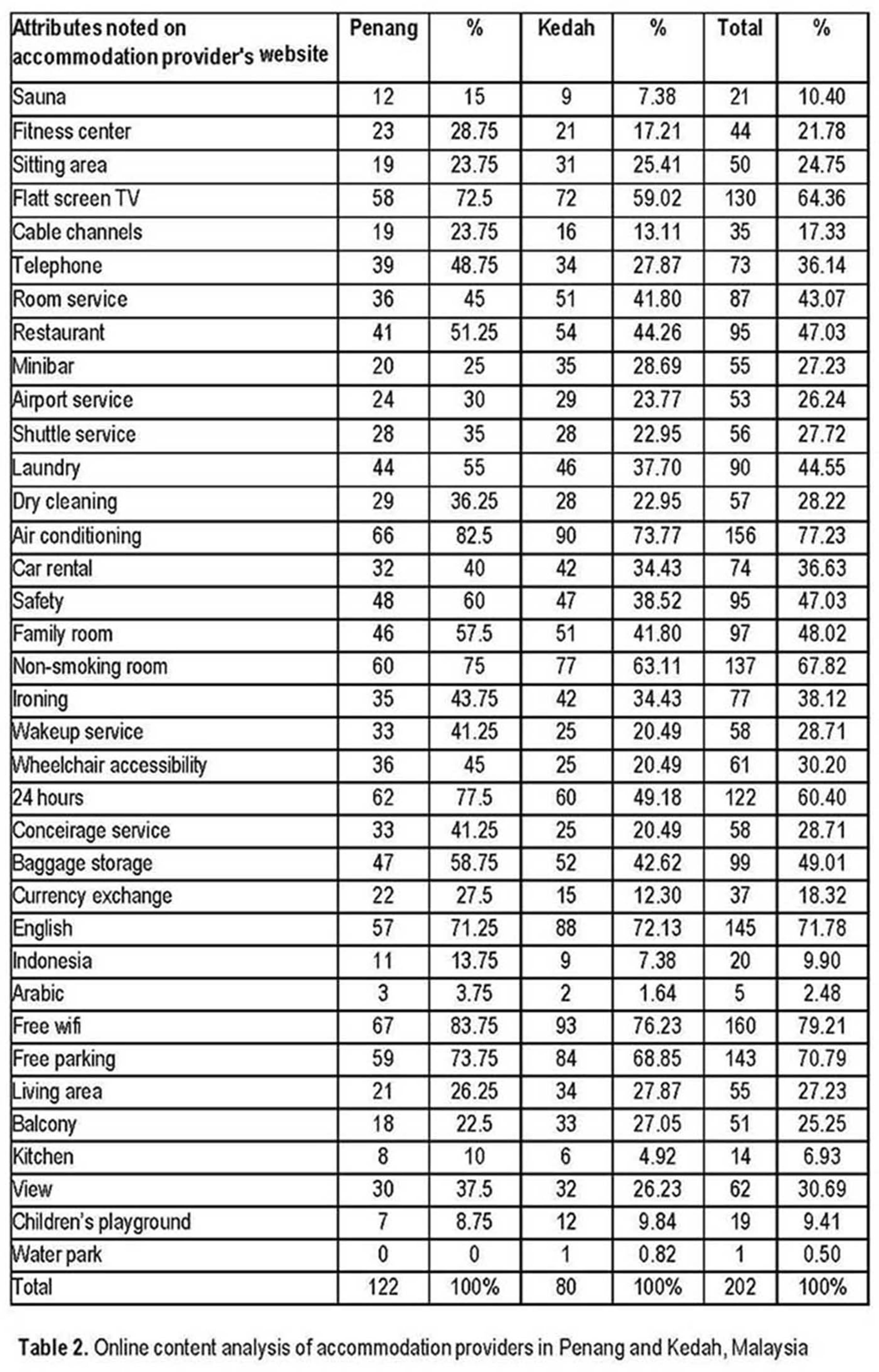 The online content analysis of different accommodation providers’ is included in Table 1. According to Battour et al. (2011),for Muslim friendly tourist support, several accommodation attributes are required, such as the provision of clear direction of Qibla and prayer mats. Another factor is the interior atmosphere in the room. Rooms must be suitably furnished and fitted with spaces allocated for prayer (Henderson: 2010,). AboutQibla direction, 41.25 % of hotels from Penang and 31.97 % from Kedah provide this facility. However, according to the online information, none of the 80 accommodations in Penang provide a praying mat in the room, while there are 15 accommodations in Kedah that provide a praying mat for visitors. Since Malaysia is a Muslim majority country, most hotels should provide a praying mat for Muslim visitors along with the direction of Qibla. This can increase customers’ satisfaction with the accommodation. Only 51 hotels from both states say that they serve halal food. There may be the accommodations provider those do not display the information regarding halal food online. Some of the restaurants and cafés served vegetarian food rather than being halal certified. Moreover, about the availability of alcohol at the minibar, most of the accommodations at Kedah (about 65 %) do not provide alcohol, where is in Penang 37.5 % provide no alcohol at the minibar inside the room. Other common attributes of hotel facilities that contribute to customers’ satisfaction are cleanliness in the hotel. Thus, some researchers argued that hygiene and cleanliness is one of the v i t a l factors f o r t r a v e l e r s (Dolnicar: 2002).