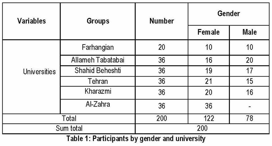 The population of this study is undergraduate students of the educational sciences from select universities in Tehran (students of Allameh Tabatabai, Shahid Beheshti, Farhangian, Tehran, Kharazmi and Al-Zahra Universities). The sample is 200 students of the mentioned universities who were selected by using the Cochran sample size formula based on the stratified random sampling method.