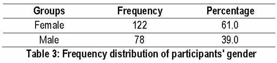 As mentioned earlier, the sample size was 200. The age of the participants in the study is reported in Table 2.