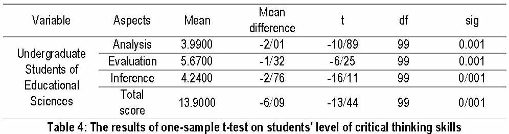 Today, experts in the field of education agree that critical thinking must not only constitute one of the goals of education but must be an integral part of it, for critical thinking is that type of thinking that leads to the best solution through analysis, evaluation, selection and application and this is what the world needs today. Given the findings of the current study, from the results of the critical thinking test, which is a well-known criterion-based test, and after comparing the scores obtained by undergraduate students of educational sciences, it can be concluded that the critical thinking skills of these students stand at a low level.