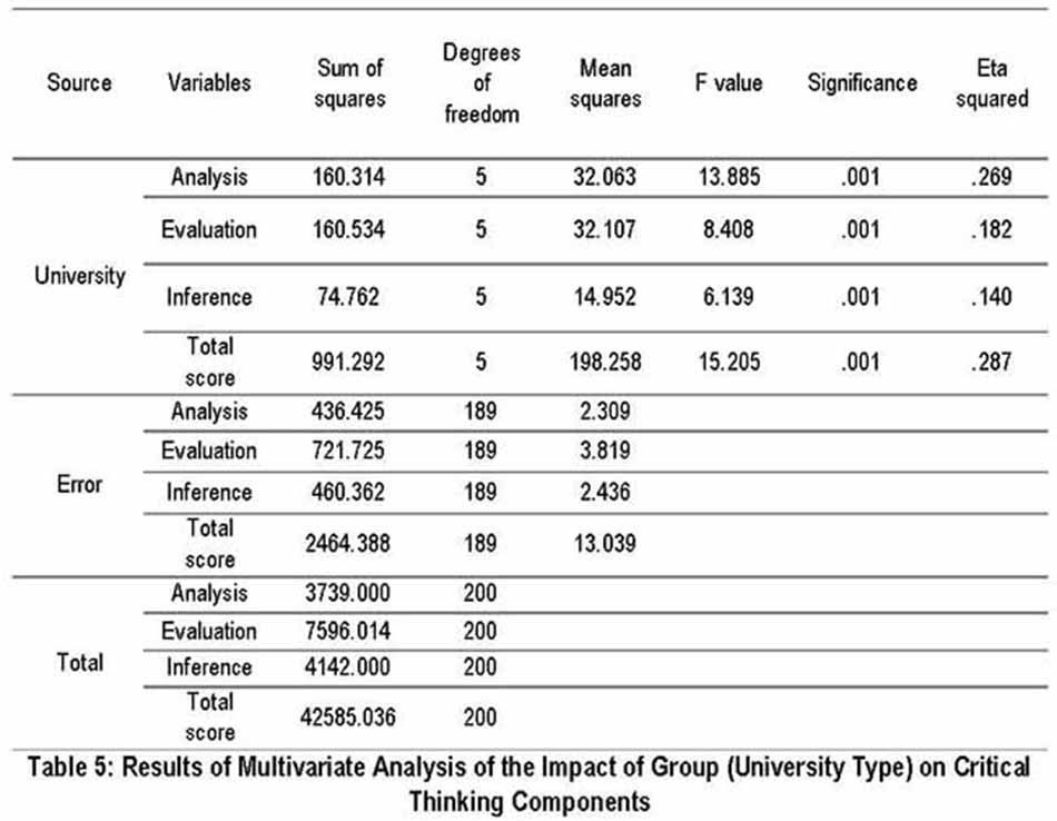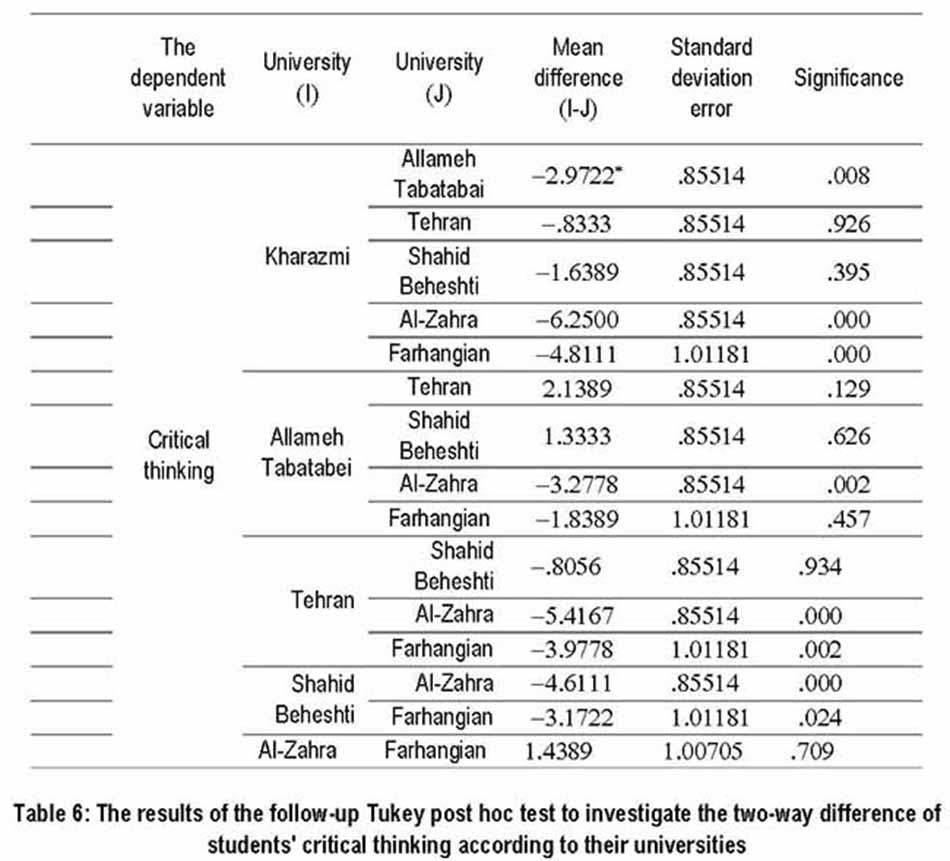 Multivariate analysis of variance was also used to investigate this question. As can be seen in the table above, the significance level for all components and the total score are less than 0.05 (p <0.05). In other words, the data in this table indicate that there is a significant difference between the students of different universities in Tehran in the different aspects of critical thinking. The significant F ratio in the table shows that there is a difference in the level of critical thinking skills of undergraduate students of educational sciences of different universities in Tehran (the value of dependent variable varies according to factor levels) but the location of this difference is not given. Therefore, the Tukey post hoc test was used for closer examination, which allowed us to compare the means one by one. Table 6 reports the results of this test for the total score of critical thinking.