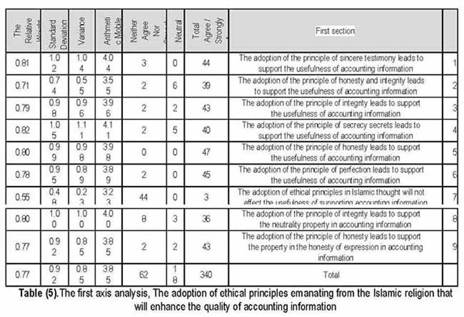 In general, it turns out that the arithmetic average of all the paragraphs of the first axis, the relationshipbetween moral principles, according to Islamic thought and the rules of professional conduct equal to 3.99 relative weight equal to 80% is greater than the relative weight neutral, "60%". The number of iterations of the scale (I agree, I agree strongly) (447 ), which constitutes 95% of the total occurrences axis indicating the respondents agree on the adoption of ethical principles emanating from the Islamic religion that will enhance the quality of accounting information. This was due to several factors and effects including:
