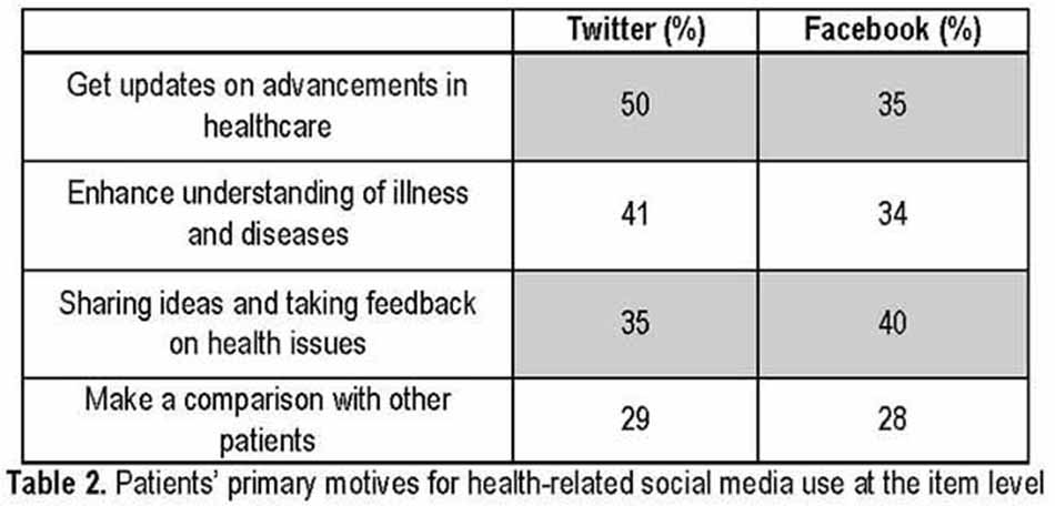 Our aim was also to find motives behind the usage of social media to identify the factors and motivesbehind the usage of different social media, i.e., Facebook and Twitter. It was found that doctors’ patient’s communication, social exchange, sharing advice, self-care, increasing awareness and knowledge on the disease, expression of emotions on their health, and to achieve a comparison on other patients were a few motives among patients and health care professionals.
