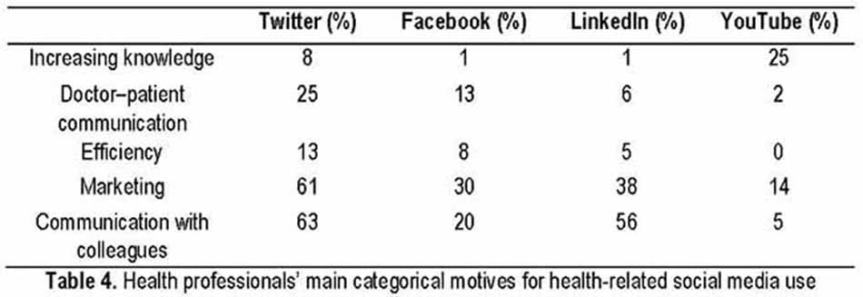 Also, social media platforms like Facebook now tends to play the role of a platform of social support wherepatients and health professional express their experience with a particular physician and express their recommendations to other people. The platform of Twitter and Facebook, in comparison to LinkedIn and YouTube, represented informality in communication among peers. LinkedIn, therefore, was utilized more for connecting healthcare professionals.