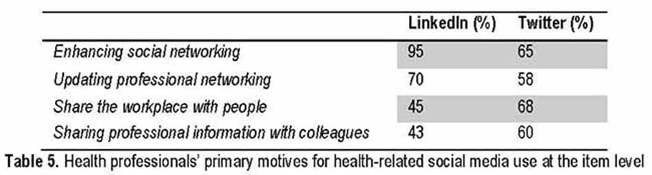 Regarding healthcare professionals, the data revealed that their primary motives included various reasons such as increasing knowledge and awareness, doctor-patient communication, professional Efficiency, marketing, and communication with colleagues. Table 4 depicts the findings with marketing and communication with colleagues rated as the highest motives on all social media platforms. Results on specific items demonstrate that the primary purpose of using social media among healthcare professionals was to enhance their network via LinkedIn (95%) and Twitter (65%), followed by updating their professional networking LinkedIn (70% ) and Twitter (58%) and sharing workplace ideas with outer world via LinkedIn (45%) and Twitter (68%).