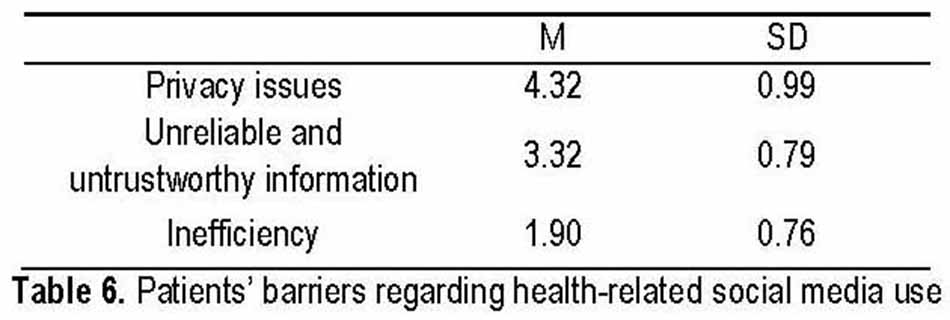 In order to explore barriers faced by both patients and healthcare professionals, we checked the frequencies at both individual and categorical levels. It was revealed that patients faced barriers like Privacy issues, Unreliable and untrustworthy information, and Inefficiency in using social media platforms for health- related issues. The highest mean 4.32, SD=0.99, was measured for privacy issues followed by unreliable and untrustworthy information and inefficiency faced in social media platforms.