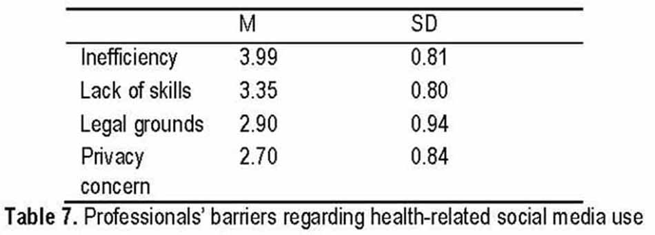 The barriers faced by health professionals varied a little but remained mostly the same such as Inefficiency, lack of skills, Legal grounds, and Privacy concerns. The highest mean 3.99, SD=0.81, was measured for inefficiency, followed by a lack of skills, legal grounds, and privacy concerns.