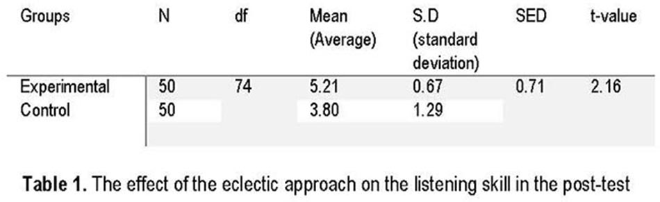 H01: The null hypothesis was rejected based on t-value 2.16 > 2.015 (table value) which shows thesignificant effect of the eclectic approach on students' listening skills. The results of the current study are consistent with the findings of Sultana (Sultana: 2014, pp. 45-48) who concluded that students who were exposed to the eclectic approach scored better in the listening skill.