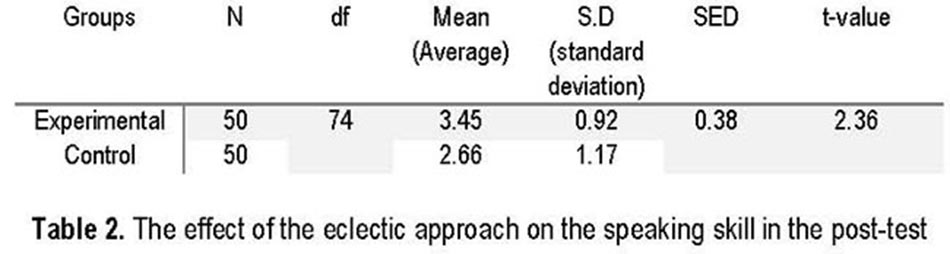 For speaking, there were 50 students in each group. According to Table 2, the average scores of the experimental and control groups were 3.45 and 2.66 respectively. The standard deviation scores of the experimental and control groups were 0.92 and 1.17 respectively. The obtained t value was 2.36 and the t table value was 2.015 which shows a significant difference between the two mean scores in the post-test in speaking, due to the implementation of the eclectic approach and leading, in turn, to the rejection of the null hypothesis.