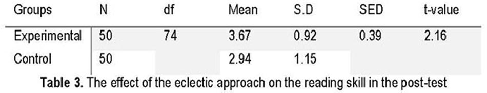 H03: The null hypothesis was rejected based on t-value 2.16 > 2.015 (t table value). The results of the study confirm the findings of the research conducted by Chen (Chen: 2011) and Katmeba and Hulu (Katmeba and Hulu: 2013) which concluded that the students who were taught according to the eclectic approach obtained better results in their reading skill compared to the control group.