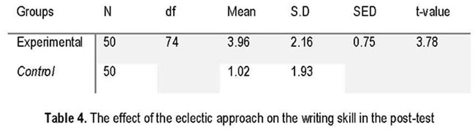 For writing, there were 50 students in each group. As shown in Table 4, the mean scores of the experimental and control groups were 3.96 and 1.02 respectively, revealing a significant difference. The standard deviation scores of the experimental and control groups were 2.16 and 1.93 respectively. The obtained t value was 3.78 and the t table value was 2.015, rejecting the null hypothesis. The experimental group outscored the control group in the writing skill, confirming the effectiveness of the eclectic approach.