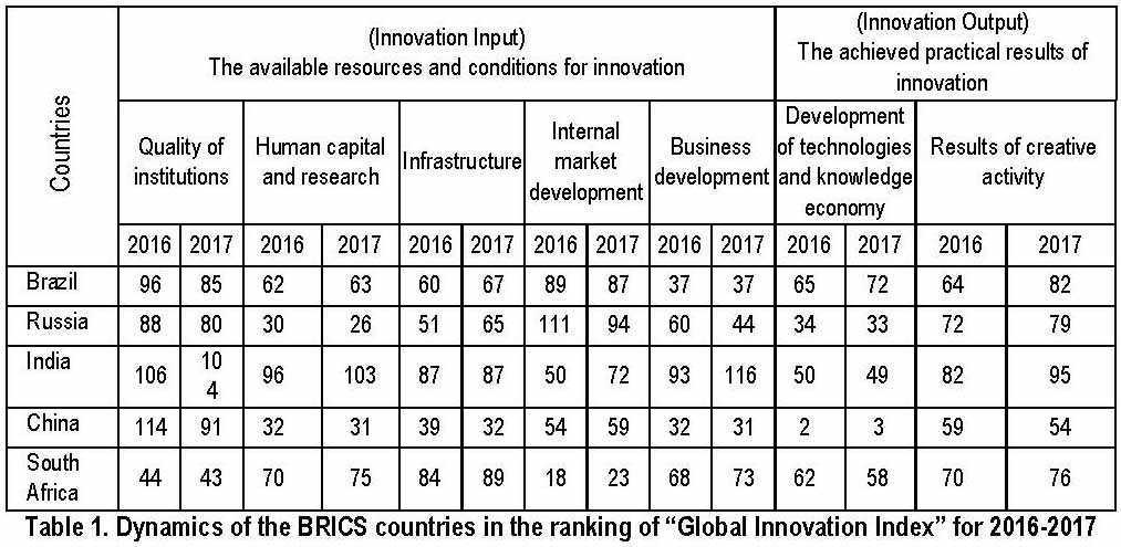 The World Intellectual Property Organization "WIPO" together with the INSEAD Business School and the Graduate School of Management at Cornell University annually compiles a rating of countries with a comprehensive comparison of their innovative activities under the name "GII" (Global Innovation Index). The index is calculated based on more than 80 indicators, they are combined into subgroups, which are included in two large groups: "Innovation Input" and "Innovation Output". (Davydenko et al.: 2017; Laureano et al.: 2018, pp. 4-7) The indicators reflect the country's potential in innovation (Innovation Input - the available resources and conditions for innovation), and the results of the implementation of this potential (Innovation Output - achieved practical results of innovation). The ratio of these groups reflects the country's effectiveness in the Innovation Efficiency Ratio, and their arithmetic average coefficient reflects the country's Global Innovation Index. The first group of indicators - “Innovation Input” - combines such indicators as the quality of institutions, human capital, and research, the country's infrastructure, as well as the development of the domestic market and business. The second group of indicators - “Innovation Output” - combines the indicators of technology development in the country and the results of creative activity. The analysis of the dynamics of changes in these groups of indicators by BRICS countries (Table 1) allowed us to draw the following conclusions (Armijo: 2007, pp. 7-42; Konkin).