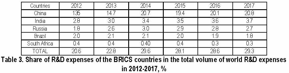 The analysis of Table 3 allows us to conclude that R&D expenses have a positive trend in all BRICS countries, while their share in the countries' GDP has not changed.