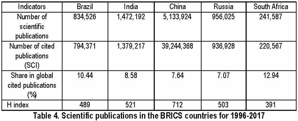 Another criterion for innovative potential is the indicator of scientific publications and their citations. Theresults of the analysis of the level of scientific publications by BRICS countries are given in Table 4.