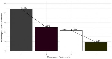 As can be seen from the analysis of the information shown in the figure, the proportion of the first-factor variation in the total data variance is 44.1%. The comparable share values of variation; 25.0% and 21.6% respectively were recorded in the second and the third factors. For the fourth factor, it was registered at just 9.3%. That is reflected in the appearance of the inflection points in the graph, one of which is between the eigenvalues of variation for the first and second factor, and the other one is between the eigenvalues of variation for the third and the fourth factors. The bending at the second point turns out to be a more articulate one, which indicates the minimal significance of the fourth factor – the level of the cooperative connection’s development in a row under consideration.