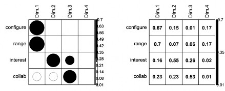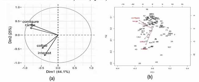 In the figure shown, the circular markers, characterized by the highest correlation values in cos2 are generally located directly along the outer edge of the matrix. The graphical markers of the lower correlation values are offset closer to the center of the matrix. From the study carried out, the factors which circular markers demonstrate their importance to the main components while residing on the periphery of the matrix, are of particular interest.