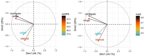 To enhance the perception of the scale (contrib) and quality (cos2) of the influence of various factors upon the main components, the correlation factor-map was supplemented with the appropriate forms of visualization (Figure 3).