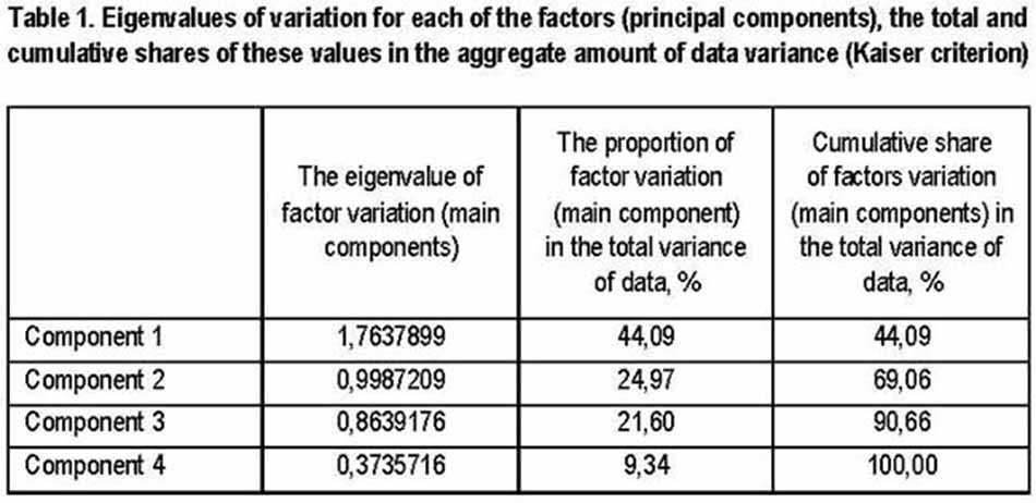 To confirm this conclusion, the calculation of the Kaiser criterion was performed, the results of which areorganized in Table 1. In the given chart the values of the cumulative share of a variety of factors (principal components) in the overall data variance are of the greatest interest.