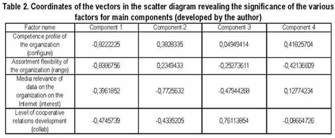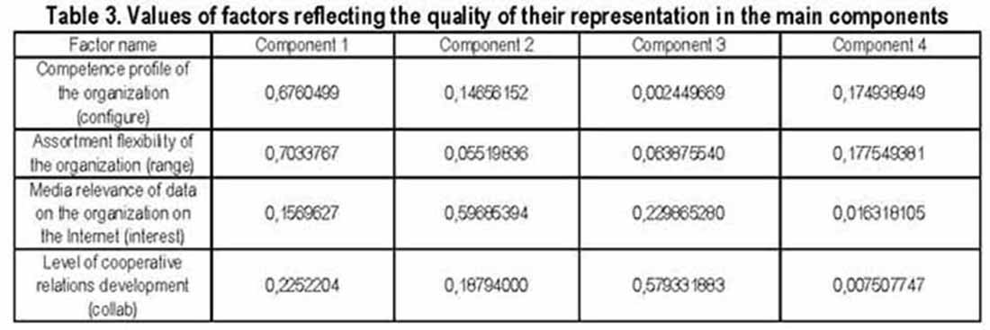Drawing on the data received, one might conclude, that 69.06% of the variation is due to the eigenvalues of the first two factors, and 90% of the variation is due to the first three factors. Thus, it can be considered that in the course of further analytical procedures, it is possible to confine ourselves merely to 'competence profile of the organization', 'assortment flexibility of the organization', 'media relevance of data on the organizationon the Internet' factors, having stricken the factor 'level of cooperative relations development' off consideration.