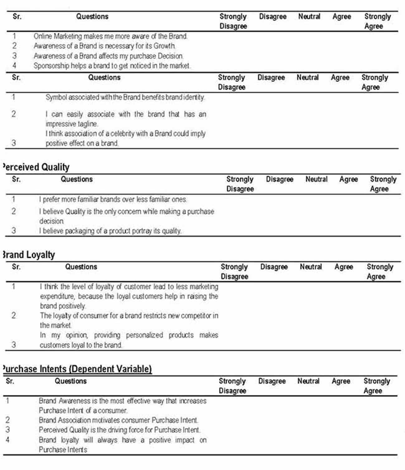 Personal Survey Technique was the method used to collect data from 260 respondents who were the frequent users of the Products. Different marketing sites were visited to collect data. Non-random based sampling technique was used to collect data through close-ended questionnaires from different places of Kuala Lumpur and Selangor, Malaysia. The purchasers/consumers of quality brands at these market places were handed out a questionnaire that consisted of various questions inquiring about brand equity and its impact on their purchase intent.