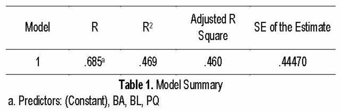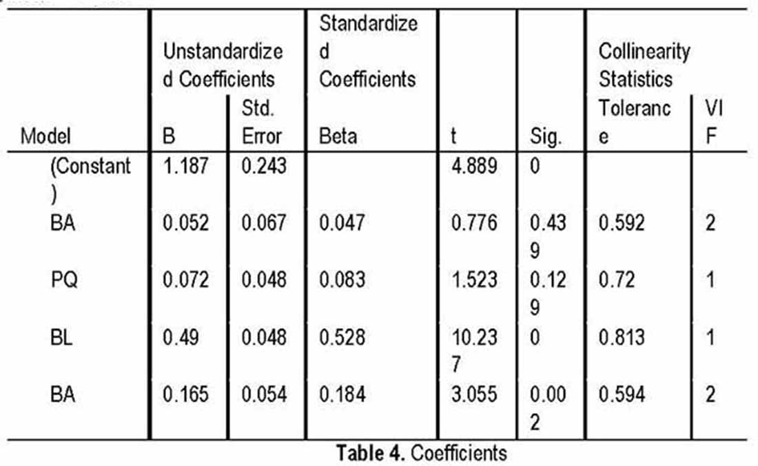 The data reveals a statistically insignificant relationship between PI and BA: P (0.439) >0.05. Also, there was an insignificant relationship between PI and PQ, i.e., P (0.129)>0.05. However, there is a significant relationship between PI and BL, i.e., P (0.000) <0.05 as well as between PI and BA, i.e., P (0.002) <0.05. It was also evident that the coefficient between all variables was above 0.05.