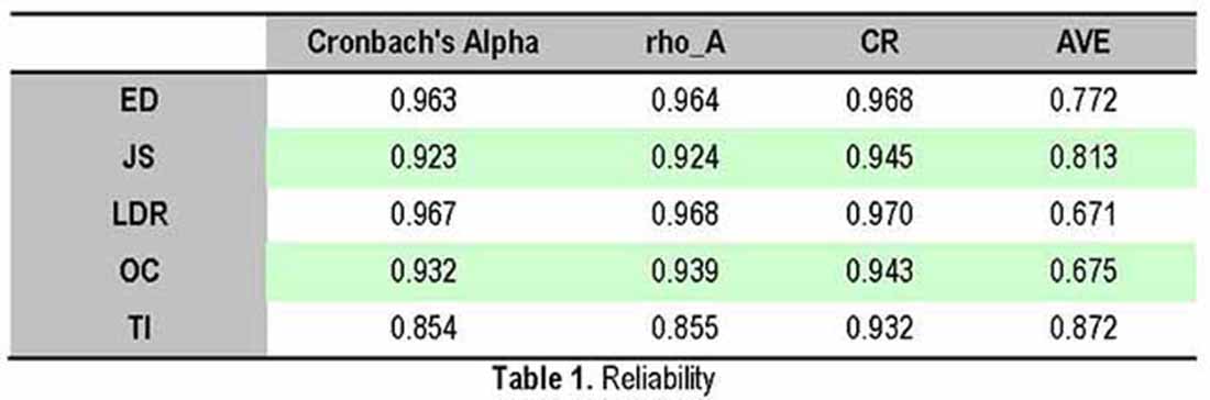 The consistency of estimates among the same test items was measured for internal consistency. It was estimated that the items proposed for the construct would measure similar scores (Hair et al.: 2013, pp. 1-12; Kalogeropoulos et al: 2020). Through the examination of CR, the reliability of internal consistency was determined. It is not used by CR that there is an equal loading indicator of the construct as assumed in Cronbach’s alpha (Hair et al.: 2013, pp. 1-12). The value of CR lies in the range of 0 and 1 (Prakash and Garg, 2019).